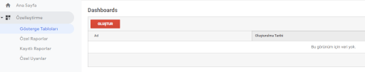 Genel anlamda ayarlarımızı tamamladık. Size kolaylık sağlayacak birkaç kısım daha göstermek istiyorum. Özelleştirme kısmında yer alan gösterge tablosu ile düzenli olarak kontrol etmek istediğiniz verileri ekleyebilir ve gözlemleyebilirsiniz. Yukarıdaki görselde yer alan gösterge tabloları kısmından oluştur butonuna tıklayın. Karşınıza boş bir gösterge tablosu gelecek. Buradan hangi verileri bir arada görmek istiyorsanız seçim yaparak tabloya ekleyebilirsiniz.