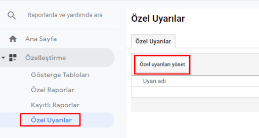 Sitenizin verileri hakkında özel uyarılar ekleyebilirsiniz. Uyarıları yönet kısmı sonrasında yeni uyarı seçeneğine tıklıyoruz. Karşımıza gelen panelden günlük, haftalık, aylık veri düşüşü, artışı gibi durumları ölçümleyebiliriz. Örneğin, sitemin trafiği haftalık olarak %30’un altına düşerse bana uyarı maili gönder veya Google Analytics hesabımdan uyar gibi. Ayrıca bu uyarı tetiklendiğinde bana e-posta gönder seçeneğini de seçersek tarafınıza mail yoluyla uyarı metni gönderilecektir.