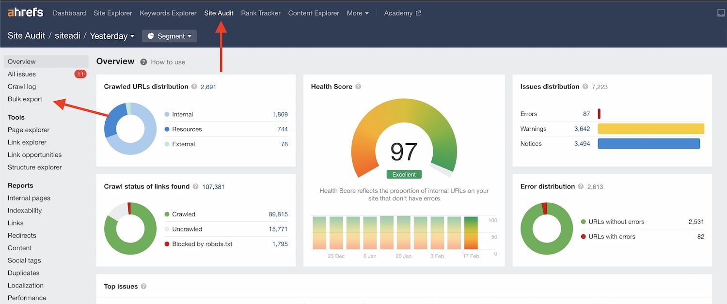 Yetim sayfalara Screaming Frog aracına göre daha basit bir şekilde Ahrefs aracı ile ulaşabiliriz. İlk olarak yapmanız gereken üst menüde yer alan ”Site Audit” alanına tıklamanızdır. Buraya tıkladıktan sonra eğer web sitenizi proje olarak eklemediyseniz proje olarak eklemeniz gerekecektir.