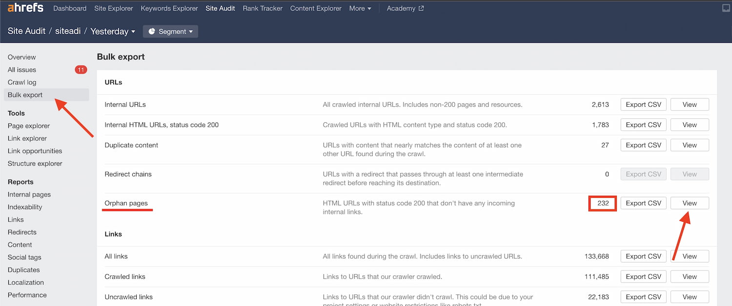 Bulk export alanına tıkladığınızda ”Orphan pages” alanında ”View” butonuna tıklayarak yetim sayfalarınıza ulaşabilirsiniz.