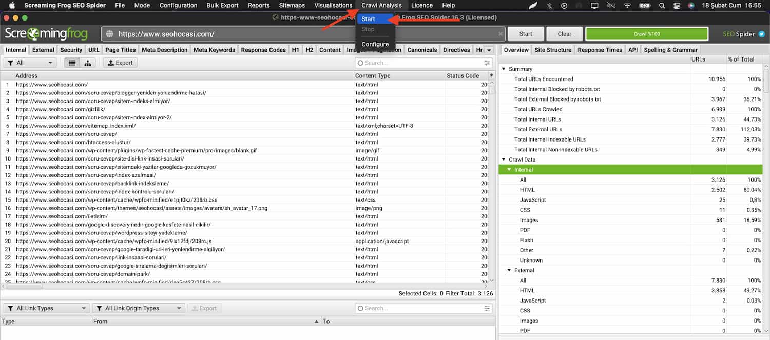Ardından normal tarama yapar gibi web site adresimizi ”Enter URL to spider” alanına yazıp ”Start” butonuna tıklamamız gerekiyor. Tarama işlemi tamamlandıktan sonra ”Crawl Analysis” sekmesinde bulunan ”Start” alanına tıklıyoruz.