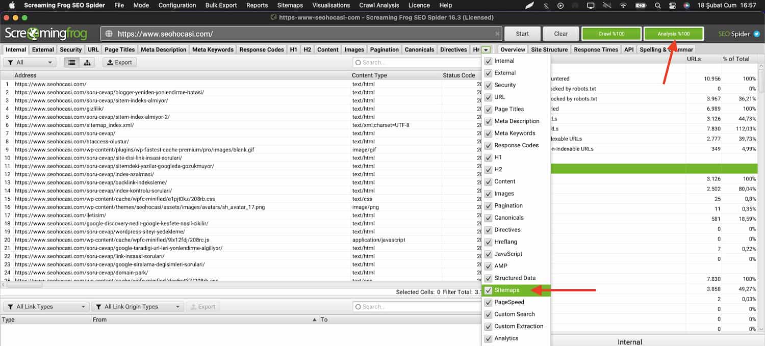 Yeni yaptığımız tarama işlemi tamamlandıktan sonra sağ alandaki sekmede yer alan ”Sitemap” sekmesi altında ”Orphan URLs” alanını görebilirsiniz. ”Orphan URLs” alanına tıklayarak yetim sayfalarınızın olduğu URL’lere erişebilirsiniz.