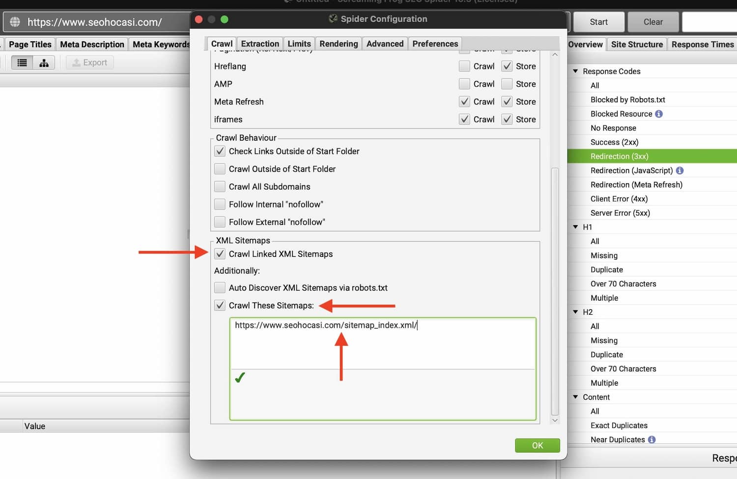 Ardından açılan ekranda ”Crawl” sekmesi altında bulunan ”XML Sitemaps” alanında yer alan, görselde birinci ve ikinci sırada belirtilmiş checkboxları işaretlemeniz gerekmektedir. Kutucukları işaretledikten sonra ”Crawl These Sitemaps” alanında sitemap adresinizi girebilmeniz için bir alan açılacaktır. O alana web sitemizin sitemap adresini girmemiz gerekmektedir.