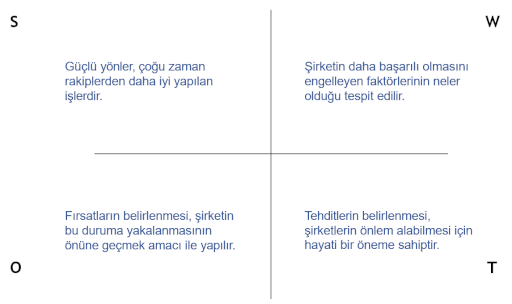 Görselde yer alan üst kısım çalışmanızın güçlü ve zayıf yönlerini temsil ediyor. Alt kısım ise fırsatlar ve tehditlerin yer aldığı aşamadır. Tam olarak 4 başlığa cevap aramanız ve bu cevapları yorumlamanız gerekmektedir.
