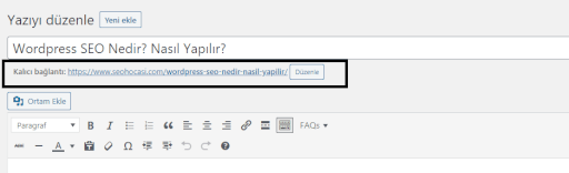 Bu noktada yapmanız gereken WordPress'in kullanıcılarına sunduğu Slug (url uzantısı) özelleştirme bölümünden faydalanarak URL adresini SEO dostu olacak şekilde kısaltmak ve optimize etmektir.